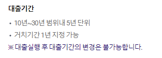 케이뱅크 아파트담보대출의 상환기간은 10년에서 30년 범위내에서 5년 단위로 선택하여 약정할 수 있으며, 거치기간은 최장 1년간 지정 가능하니 참고바랍니다.