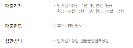 원금균등할부상환의 경우 5년 이내에서 대출기간이 결정되며, 대출초기 상환금 부담을 줄여주는 거치기간은 부여할 수 없으니 참고바랍니다.