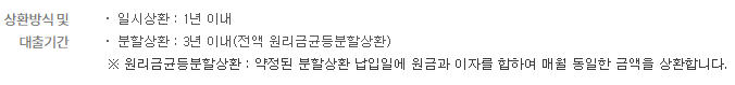 원리금균등분할 상환의 경우 3년 이내에서 대출을 신청하시는 분이 선택할 수 있으며, 대출초기 상환금 부담을 줄여주는 거치기간은 부여할 수 없습니다.