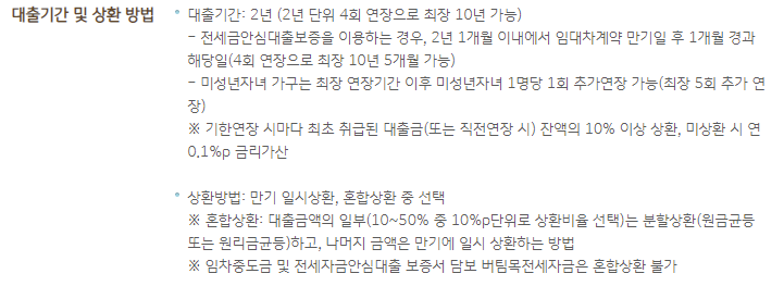 대출기간은 2년으로 약정되며 2년 단위로 4회 연장하여 총 10년간 이용할 수 있으며, 보다 자세한 사항은 국민은행 영업점으로 문의하시길 바랍니다.