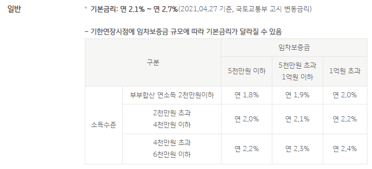 이 금리는 부부합산 소득수준 및 임차보증금액에 따라 달라지는데, 부부합산 소득이 적을 수록, 임차보증금액이 낮을 수록 대출금리가 낮아집니다.