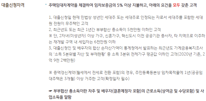 - 대출신청인 및 배우자의 합산 순자산가액이 2억 9천 200만원(2020년도 기준) 이하일 것