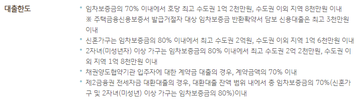 신혼가구는 임차보증금의 80% 이내에서 수도권 2억원, 수도권 이외 지역의 경우 1억 6천만원 이내에서 한도가 책정됩니다.