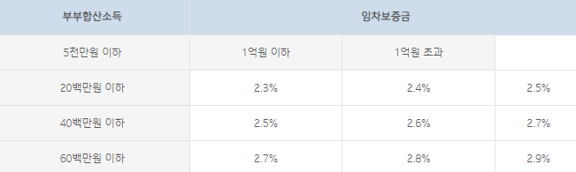 부부합산 연소득이 낮을 수록, 임차보증금액이 적을 수록 금리는 낮아지게 됩니다.