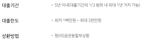 대출기간은 5년 이내에서 대출을 신청하시는 분이 결정할 수 있으며, 대출초기 상환금 부담을 줄여주는 거치기간은 최대 1년간 부여할 수 있습니다.
