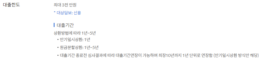 만기일시상환의 경우 1년으로 결정되며, 대출기간 종료전 심사결과에 따라 대출기간 연장이 가능하며 1년단위로 연장하여 최장 10년까지 이용할 수 있습니다.