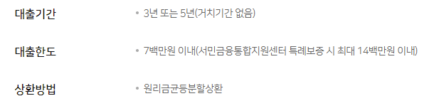 대출기간은 3년 또는 5년중 하나를 대출을 신청하시는 분이 선택할 수 있으며, 대출초기 상환금부담을 줄여주는 거치기간은 이용할 수 없으니 참고하시길 바라빈다.