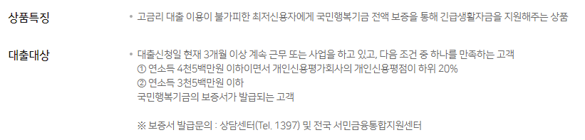 농협은행에서는 고금리 대출 이용이 불가피한 최저신용자에게 국민행복기금 전액보증서를 통해 긴급생활자금을 지원해주는 정부지원 서민금융상품을 취급하고 있습니다.