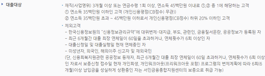 - 연소득 4500만원 이하이면서 개인신용평점 하위 20%에 해당하는 분