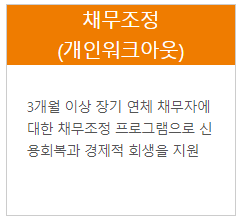 ▶신용회복위원회의 프리워크아웃과 개인워크아웃은 신용회복지원중 실직 및 질병등의 사유로 변제금을 납부하기 어려운 경우 최대 2년까지 변제금 납부를 유예할 수 있어 끝까지 완제할 가능성이 높아집니다.