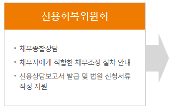 신용회복위원회에서는 채무상환이 어렵거나 파산상태에 직면한 경우, 법적구제제도 상담 및 개인회생 법원 신청 업무를 무료로 지원하고 있습니다.