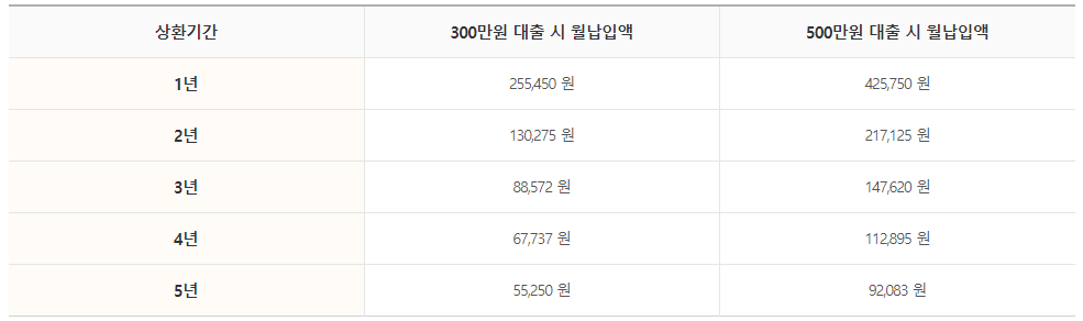 대출금리는 연 3~4%의 금리가 적용되며, 아래 대출 상환예시 금액을 참조바랍니다.