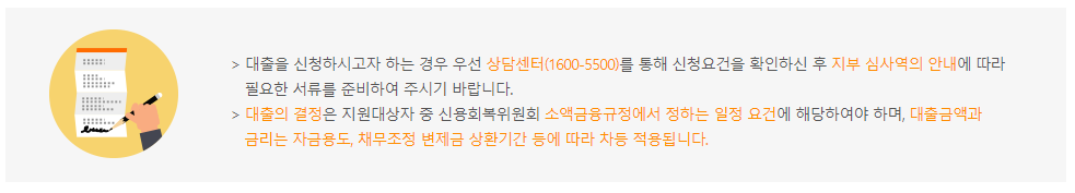 서민금융 통합지원센터에서 대출신청을 한다고 하다라도 최종 대출 결정은 신용회복위원회 소액금융규정에서 정하는 일정요건에 따라 대출이 거부될 수 있으며, 대출금액과 금리는 자금용도 및 채무조정 변제금 상환기간등에 따라 차등 적용되니 참고바랍니다.