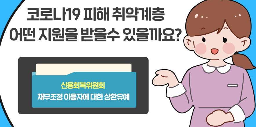 신용회복위원회에서는 코로나19로 인한 휴직 및 실직, 휴업 및 폐업으로 인해 변제금을 정상납입하지 못하는 분들에게 상환유예를 신속히 제공하고 있습니다.