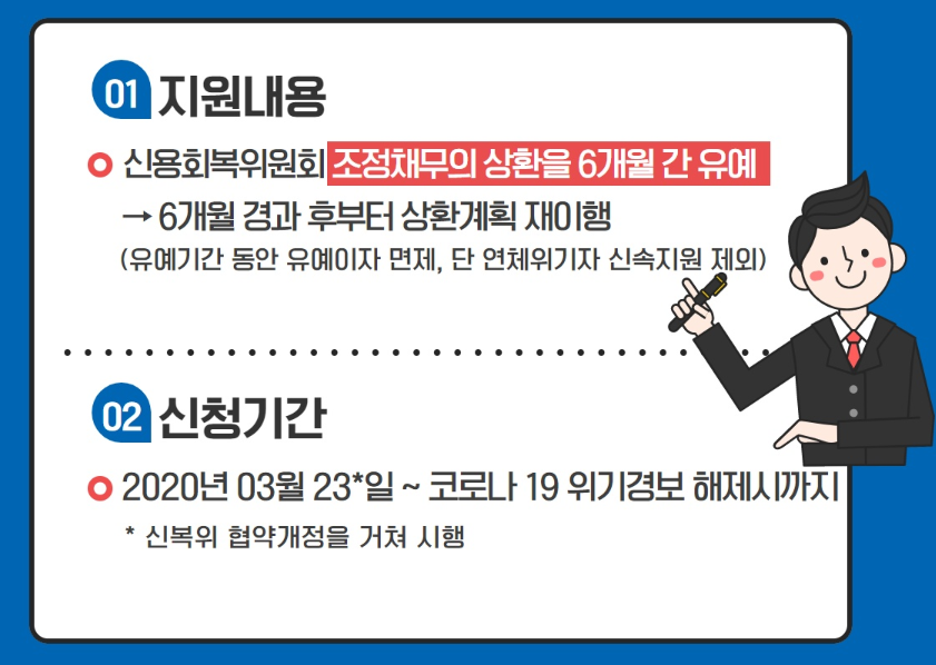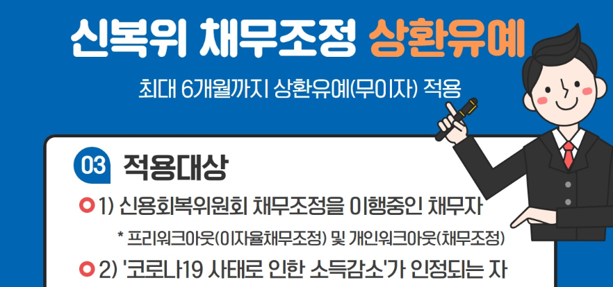 신용회복위원회 채무조정 상환유예 적용되상은 신용회복위원회 채무조정을 이행중인 채무자가 코로나19 사태로 인한 소득감소가 인정되면 신청 대상이됩니다.