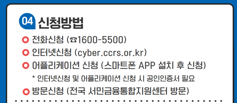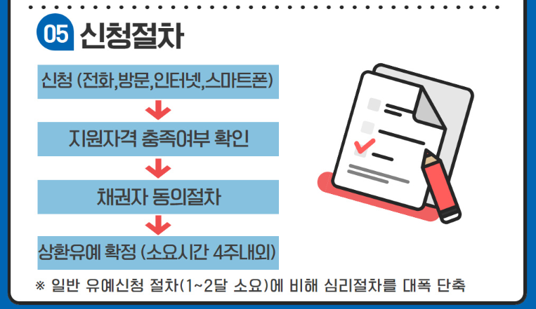 신청방법은 위와 같으니 참고하셔서 채무조정 상환유예를 신청하시길 바랍니다.