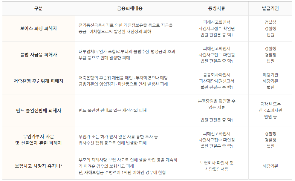 보이스피싱 등에 의한 금융피해를 입은 취약 계층으로 다음의 요건에 해당하는 경우 지원대상이 됩니다.