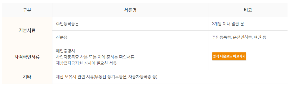 - 자격확인서류 : 폐업증명서, 사업자등록증 사본, 재창업자금지원 심사에 필요한 서류