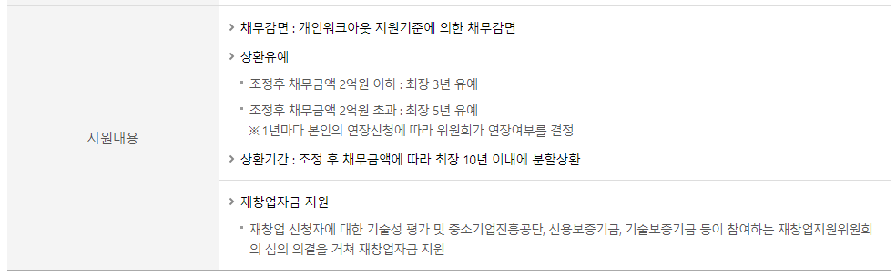 중소기업 재창업대출의 지원내용은 크게 채무조정과 재창업자금 지원으로 이루어져 있습니다.