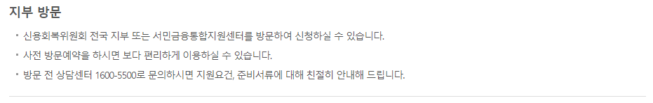 신용회복위원회 전국 지부 또는 서민금융통합지원센터를 방문하여 신청할 수 있습니다.