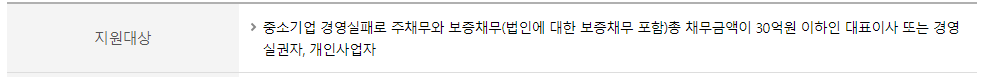 중소기업 재창업대출의 지원대상은 중소기업 경영실패로 주채무와 보증채무의 총 채무금액이 30억원 이하인 대표이사 또는 경영실권자, 그리고 개인사업자입니다.