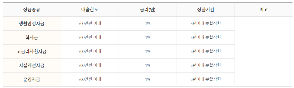 대출금리는 자금용도에 관계없이 연간 1%의 저금리가 책정되며 신청한 모든 분들에게 동일한 금리가 적용되니 참고바랍니다.