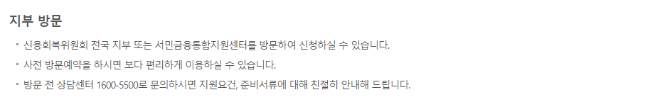 서민금융통합지원센터에 방문하여 종합적인 상담을 받고 신청하시려면 상담예약 후 방문하시면 되고, 인터넷으로 간편하게 신청하고자 한다면 신용회복위원회 사이버지부 회원가입 후 신청하면 되니 참고바랍니다.