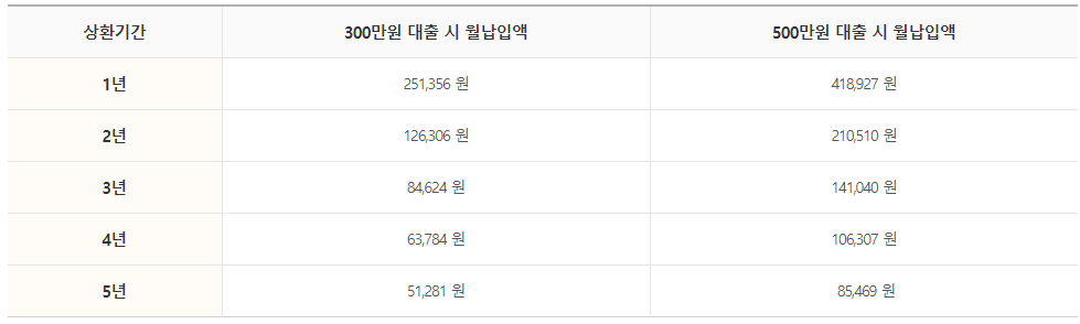 상환기간은 5년이내 분할상환의 방식으로 진행되며, 대출 실행 이후에는 대출기간을 변경할 수 없으니 아래 월납입액 예시표를 확인하여 실제 상환가능한 기간으로 선택하시길 바랍니다.