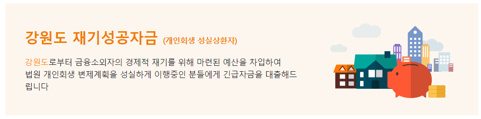 강원도 개인회생대출은 강원도로부터 금융소외자의 경제적 재기를 위해 마련된 예산을 차입하여 법원 개인회생 변제계획을 성실하게 이행중인 분들에게 긴급자금을 대출하는 정부지원 대출상품입니다.