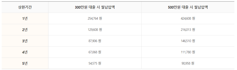 다만 대출실행 후 상환기간 변경이 불가하니 위의 상환금액 예시표를 참고하셔서 상환기간을 선택하시길 바랍니다.