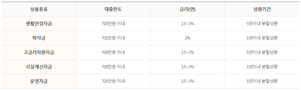 각 자금별 최고 한도는 700만원이며, 금리는 연간 2~3%사이로 책정됩니다. 단일금리로 제공되기 때문에 신청하는 모든 분들에게 동일한 금리가 제공되니 참고바랍니다.