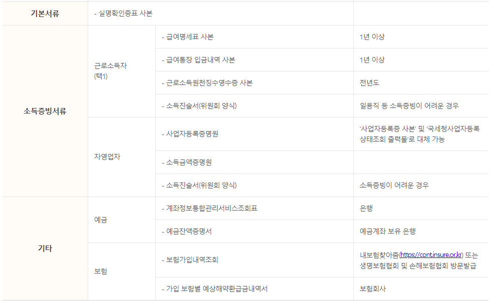 - 자영업자 소득증빙서류 : 사업자등록증명원, 소득금액증명원, 소득진술서