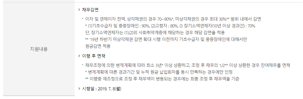 신용회복위원회 취약채무자 특별면책제도의 지원내용은 아래와 같습니다.