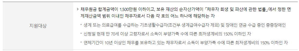 - 연체기간이 10년 이상인 채무를 보유하고 있는 채무자로서 소득이 부양가족수에 따른 최저생계비의 150% 이하인 분