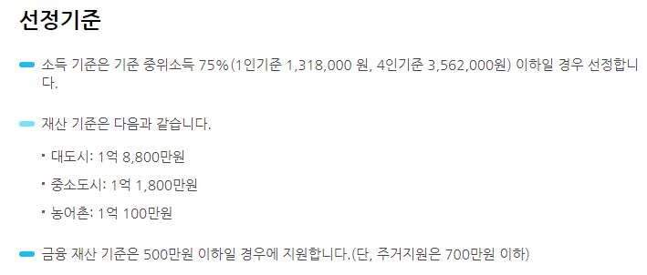 - 소득기준 : 기준 중위소득의 75% 이하 (1인 기준 1,318,000원, 4인기준 3,562,000원)