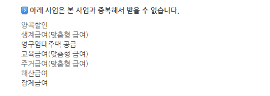 긴급복지 연료비 및 전기요금은 아래의 지원사업과는 중복해서 받을 수 없습니다.
