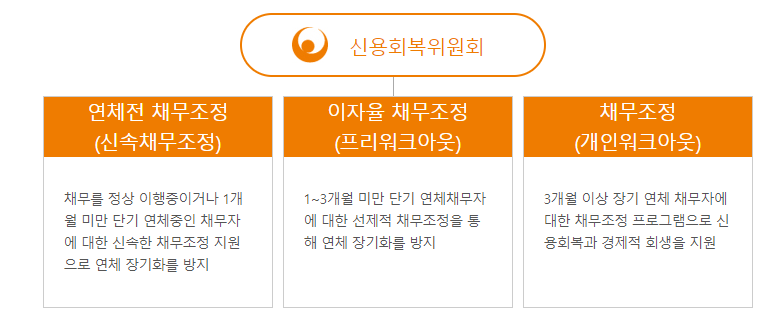 신용회복위원회의 워크아웃 제도는 사전채무조정, 프리워크아웃, 개인워크아웃 총 3가지가 있습니다.
