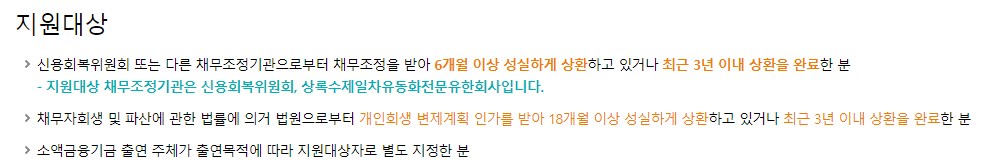 지원대상 채무조정기관은 신용회복위원회, 상록수제일차유동화전문유한회사입니다.