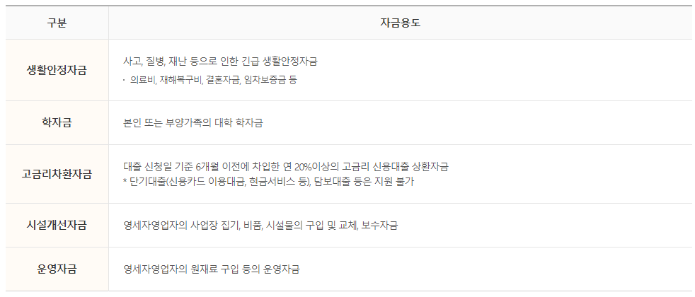 신용회복중 대출은 아래의 필요자금 용도에 해당하는 경우 대출 신청이 가능합니다.