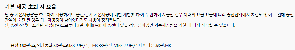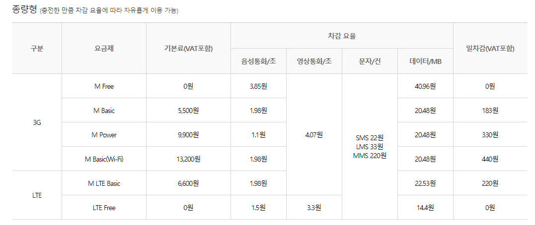 먼저 종량형 요금제는 사용한만큼 선불로 충전한 금액에서 차감하는 방식이며, 예전 2G폰을 사용할 때와 비슷하게 요금 요율이 적용됩니다.