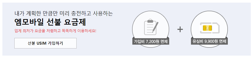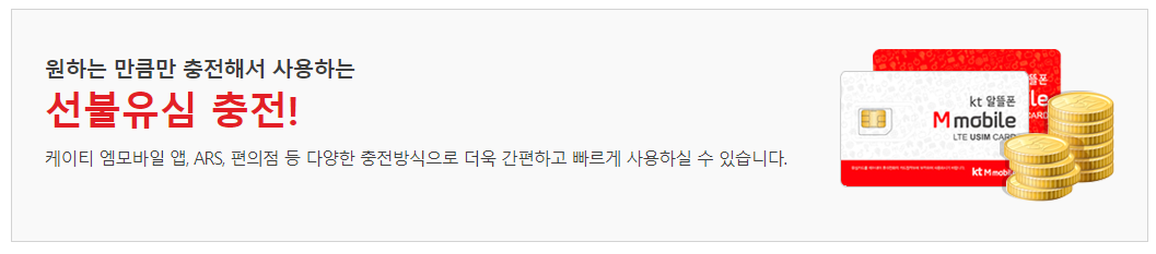 KT엠모바일 선불유심은 통신요금을 선불로 미리 충전해놓고 이용할 수 있는 알뜰폰 요금제입니다.