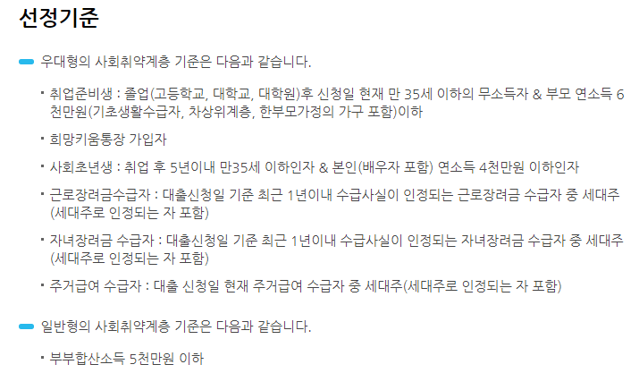 우대형 선정기준 : 취업준비생, 희망통장가입자, 사회초년생, 근로장려금수급자, 자녀장려금 수급자, 주거급여 수급자