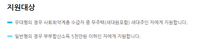 우대형의 경우 사회취약계측 수급자 중 세대원 포함 무주택인 세대주가 지원대상이 됩니다.