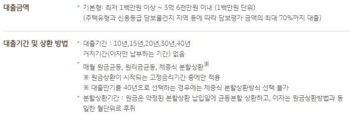 주택 유형과 신용등급, 담보물건지 지역 등에 따라 담보평가 금액의 최대 70%까지 대출이 가능합니다.