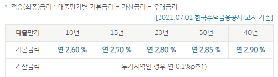 대출기간 10년의 경우 연 2.60%, 15년의 경우 연 2.70%, 20년의 경우 연 2.80%, 30년의 경우 연 2.85%, 40년의 경우 연 2.90%의 금리가 적용됩니다.