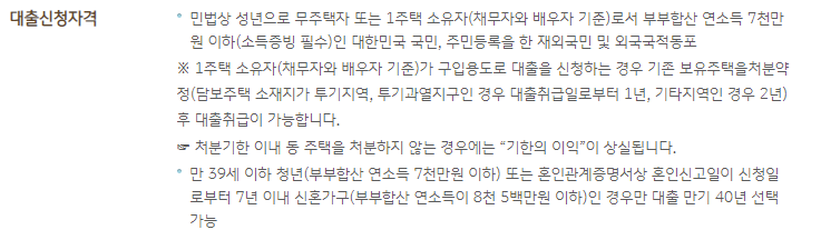 만 39세 이하 쳥년 또는 혼인관계증명서상 혼인신고일이 7년이내 신혼가구라면 연소득이 8500만원 이하이면 대출 취급이 가능합니다.