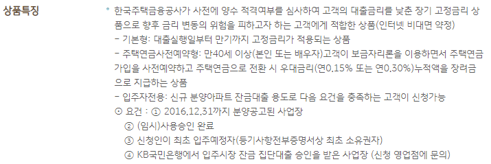 보통 일반형을 많이 이용하는 편이며, 신규 분양아파트 잔금을 치루는 용도로 이용하고 있는 정부지원 주택담보대출 상품입니다.