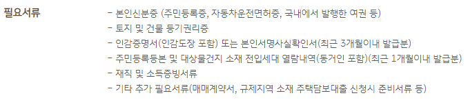 - 주민등록등본 및 대상물건지 소재 전입세대 열람내역 : 최근 1개월 이내 발급분