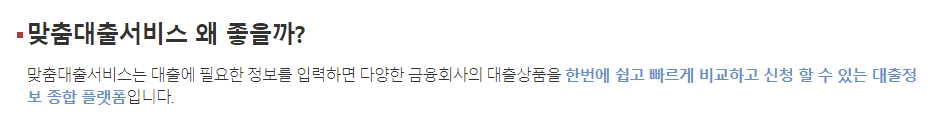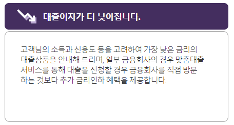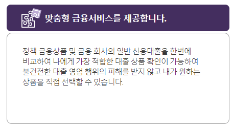 01. 맞춤형 금융서비스를 제공합니다. 정책금융상품 및 금융회사의 일반 신용대출을 한번에 비교하여 나에게 가장 접합한 대출상품을 확인할 수 있습니다.