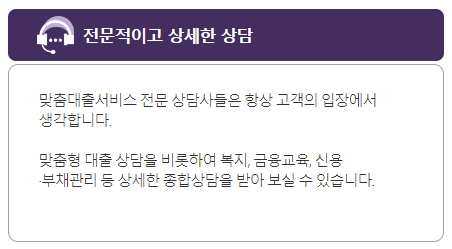 03. 전문적이고 상세한 상담을 진행합니다. 맞춤대출 서비스 전문 상담사들이 맞춤형 대출 상담을 비롯하여 복지, 금융교육, 신용 및 부채관리 등 상세한 종합상담을 제공하고 있습니다.